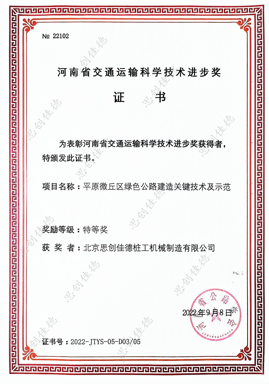 熱烈祝賀北京思創佳德樁工機械制造有限公司榮獲河南省交通運輸科...